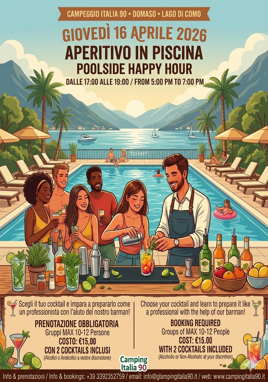 Möchtest du die Geheimnisse hinter deinen Lieblingscocktails entdecken? Am Donnerstag, den 16., 23. und 30. April, lädt dich der Campingplatz Italia 90 zu einem unverzichtbaren Event ein: unserer ersten Poolside Happy Hour mit Masterclass!